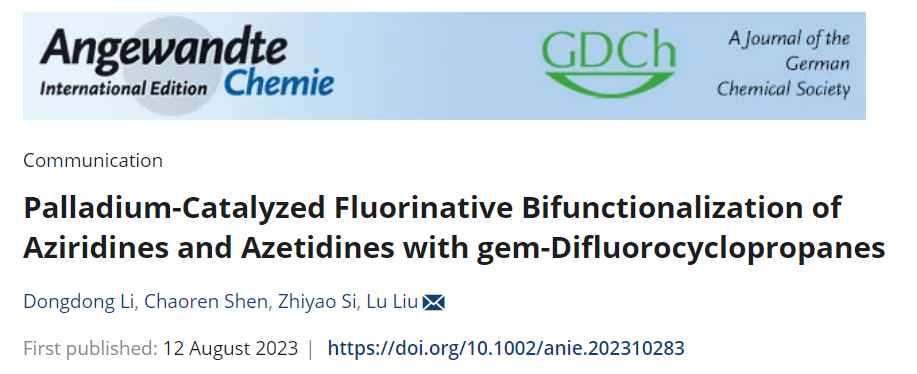 相关成果以“Palladium-Catalyzed Fluorinative Bifunctionalization of Aziridines and Azetidines with gem-Difluorocyclopropanes”为题于2023年8月12日在线发表于Angewandte Chemie International Edition上 (DOI: 10.1002/anie.202310283)。性爱视频 2019级博士研究生李冬冬为论文第一作者,沈超仁副研究员为共同一作,刘路教授为论文通讯作者,硕士生司志姚也参与此课题的研究。该项工作得到了国家自然基金科学委和上海市科委项目资助。